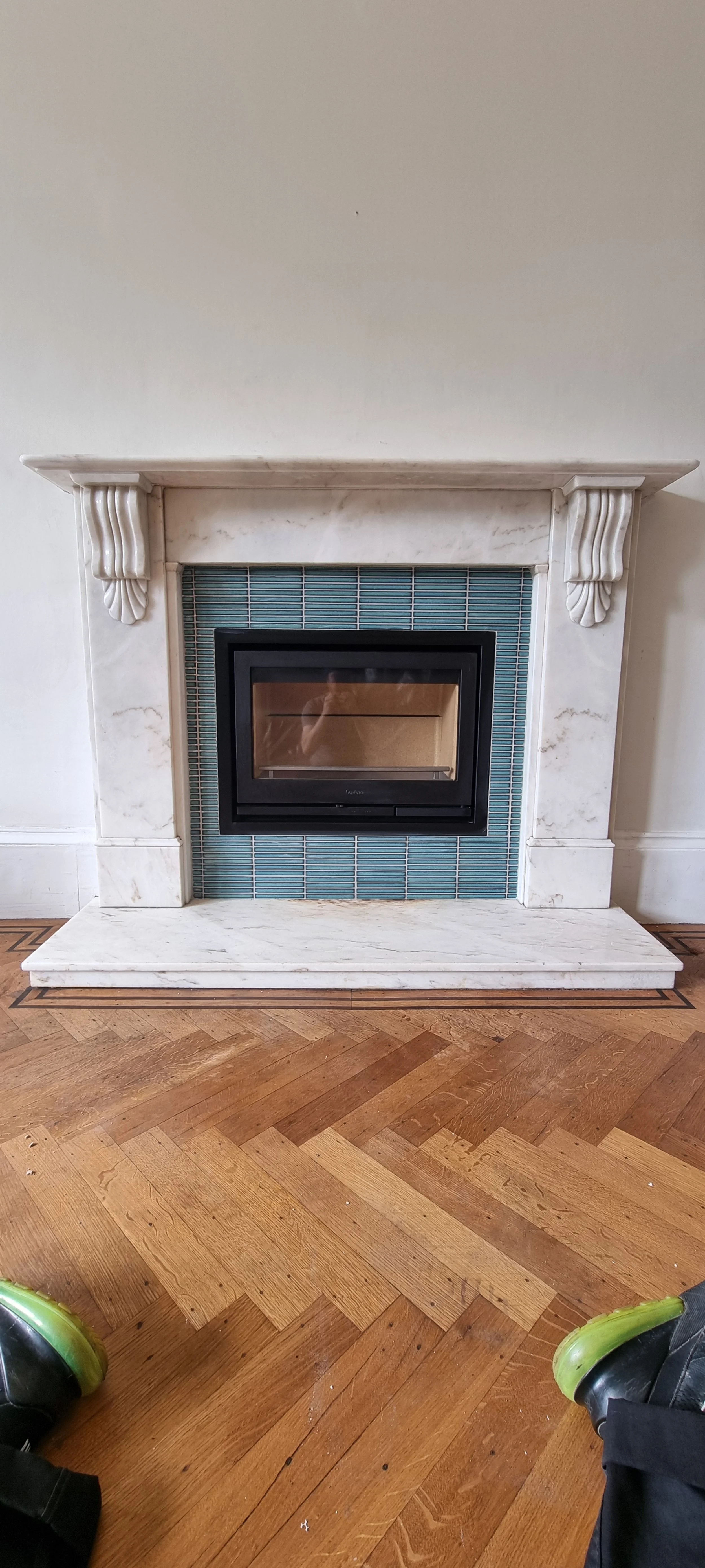 A white marble fireplace with teal tile accents and a black firebox, situated on a herringbone wooden floor.